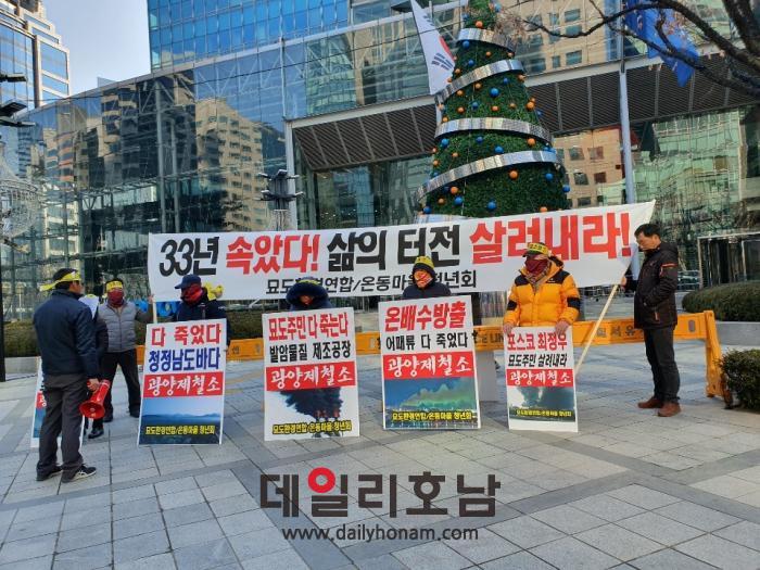 여수 묘도환경연합과 온동마을청년회원들은 16일 오전 서울 역삼동 포스코센터 앞에서 집회를 갖고 광양제철소로 인한 환경피해 조사와 재발 방지를 위한 행정처분을 촉구하고 나섰다.