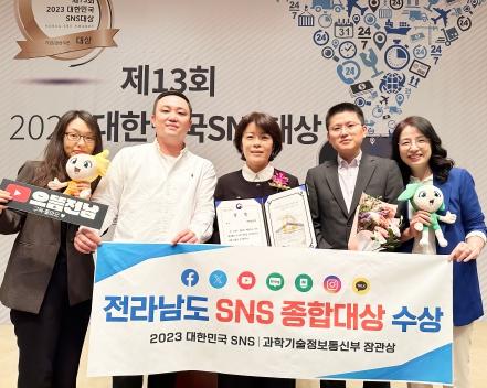전라남도가 ‘1분 컷’, ‘쩐라남도’ 등 구독자 눈높이에 맞춘 재밌고 알찬 콘텐츠로 누리소통망(SNS) 채널을 운영해 ‘2023 대한민국 SNS 대상’에서 최고상인 ‘종합대상(과학기술정보통신부 장관상)’을 수상했다.