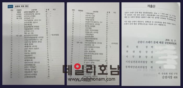 [단독입수] 2018년도 순천시 쓰레기 문제해결 공론화위원회 회원들의 명단(왼쪽과 가운데)과 순천시장에게 전달한 권고안에 서명한 대표 5인. (데일리호남 DB)