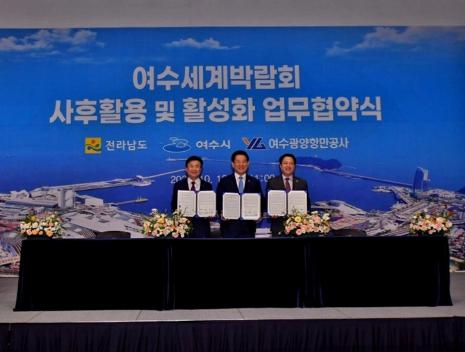 여수시가 16일 오전 여수세계박람회장 컨벤션센터에서 전라남도, 여수광양항만공사와 여수세계박람회 사후활용 활성화를 위한 업무협약을 체결했다.