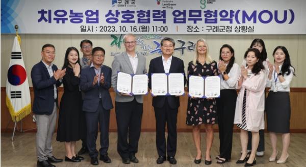 전남 구례군은 10월 16일 ‘구례군 치유농업’ 상호 협력 및 발전을 위해 네덜란드 치유농업협회(Federation agriculture and care)와 벨기에 녹색치유지원센터(The flemisch support center for green care)와 업무협약을 체결했다.