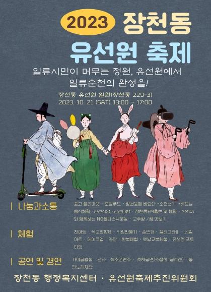 이번 유선원 축제는 난타공연을 시작으로 유선원의 정서와 잘 어울리는 가야금병창, 트로트가수 축하공연과 함께 사전에 접수한 동민 노래자랑을 통해 장천동민의 화합과 결속을 다지는 장으로 준비했다.
