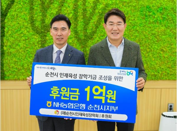 이날 NH농협은행 순천시지부(지부장 조상명)가 전년도에 이어 올해도 1억 원의 후원금을 전달했다. NH농협은행 순천시지부는 2011년부터 누적 6억 1천5백만 원을 순천시인재육성장학회에 꾸준히 후원해 왔다.