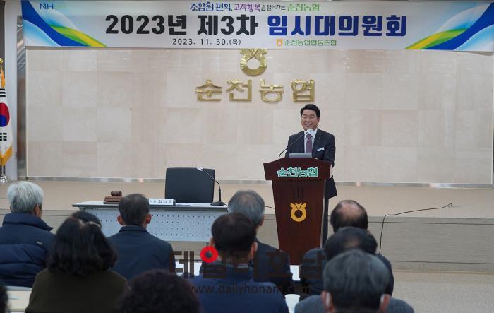 전남 순천농협이 지난 30일 제3차 임시대의원회를 개최해 전국에서 처음으로 ‘청년이사제’를 도입하는 내용의 정관 개정 의결했다. 사진은 최남휴 조합장이 대의원들에게 도입 취지를 설명하고 있는 모습. (순천농협 제공)