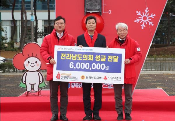 이날 전달한 기부금은 전라남도의회 ESG 실천의 일환으로 전체 의원과 의회사무처 직원들이 자발적으로 매월 급여 중 1만 원 이하 끝전을 모은 것으로, 올해 4월부터 적립한 600만 원을 기부하게 됐다.