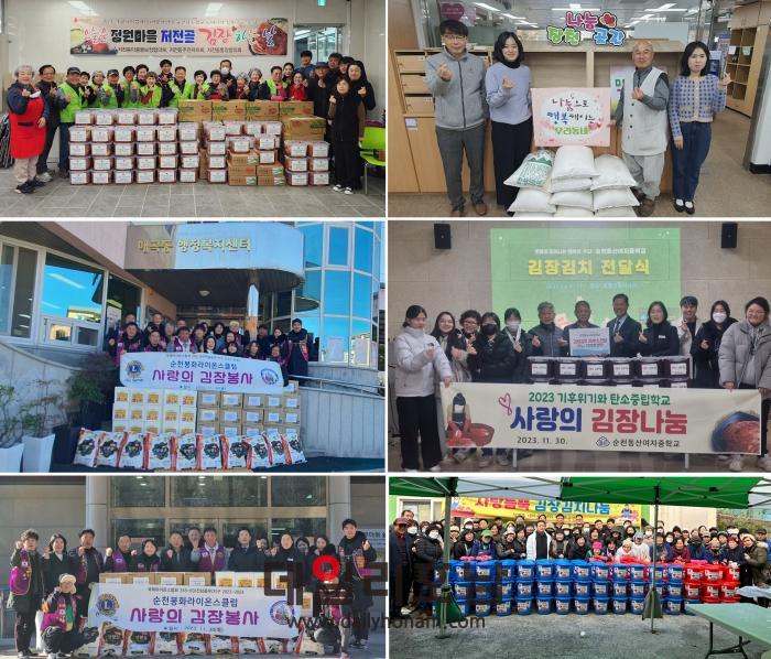 이날 기부 창구에는 순천동산여중 김장 김치 24박스, 순천봉화라이온스클럽 김장 김치 19박스, 백미(20kg) 10포, 라면 16박스, 천우ENG·파인드네이처 각각 백미(10kg) 15포와 10포씨을 기부했다.