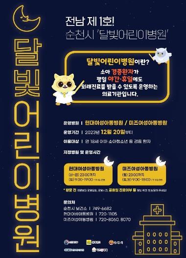 순천시는 전남 제1호 달빛어린이병원으로 지정된 현대여성아동병원과 미즈여성아동병원이 오는 20일부터 진료를 시작한다고 밝혔다.