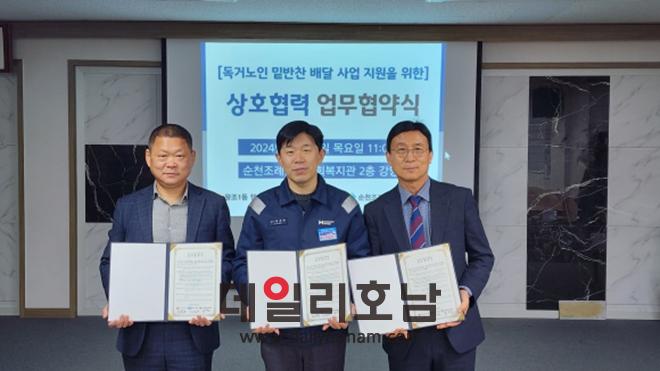 현대제철 순천공장이 지난 18일 순천조례종합사회복지관에서 ‘독거노인 밑반찬 배달 사업’에 대한 업무 협약을 체결했다. 사진 왼쪽부터 정학규 왕조1동장, 한규현 현대제철 순천공장 냉연지원실장, 류상철 순천조례종합사회복지관 관장 순이다. (순천시 제공)