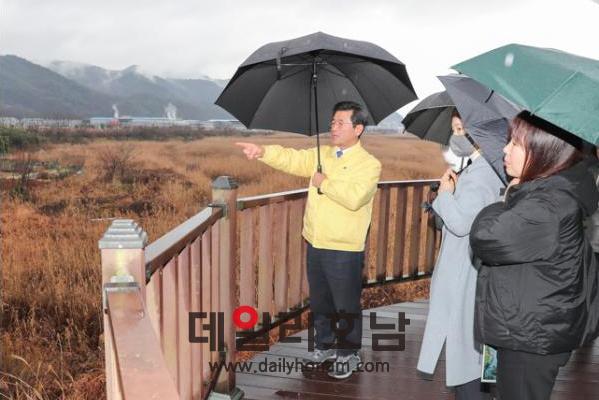 동천과 서천, 억만천과 인덕천이 만나는 합강 일대에 훼손·단절된 습지 생물 서식처 복원, 생태탐방로와 생태체험 공간 등을 조성하는 광양읍 합강 도시생태축 복원사업 현장에서 보고를 받고 현장을 점검했다.