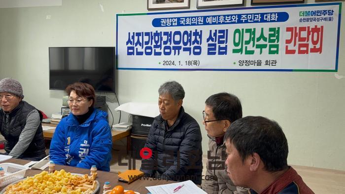 지난 18일 구례군 양정마을 회관에서 섬진강 유역 주민들을 만난 권 예비후보는 섬진강유역환경청 설립에 대한 의견을 청취했다. 또 설립의 당위성에 공감하며 홍수 피해 이후, 진행 상황 등을 귀담아 듣는 자리를 가졌다.