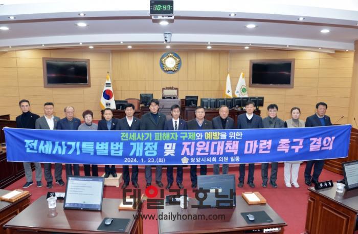 시의회는 이날 “정부와 광양시가 전세사기 피해를 명백한 사회적 재난으로 인정하라”고 밝히며 ▲정부는 특별법을 조속히 개정하여 피해자들의 피눈물을 닦아줄 폭넓은 선구제 방안을 마련할 것 ▲광양시는 전세사기피해자의 조속한 구제가 가능하도록 법률·주거·금융지원이 원스톱으로 제공되는 종합 지원대책을 즉각 마련할 것을 강력히 촉구했다.
