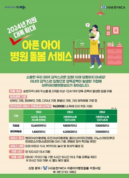 순천시는 2024년 1월부터'아픈 아이 병원돌봄 서비스'가 더 촘촘하고 현실적인 도움이 될 수 있도록 확대 강화한다고 밝혔다. 이를 위해 2023년 7월 서비스 개시 이후 지속적인 모니터링에 따른 개선점을 반영했다.