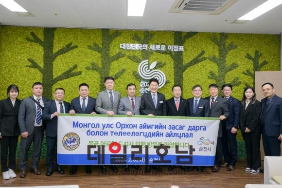 순천시와 체육 분야 등 상호교류를 협력하기 위해 방문한 투멘자르갈 몽골 오르홍 도지사 등 관계자들은 노관규 시장과 면담을 한 후 돌아갔다. (순천세계수석박물관 제공)