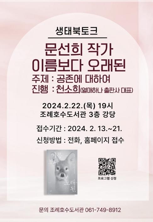 생태북토크에 참여하고 싶은 시민은 21일까지 순천시립도서관 홈페이지나 조례호수도서관으로 전화를 통해 신청하면 된다.