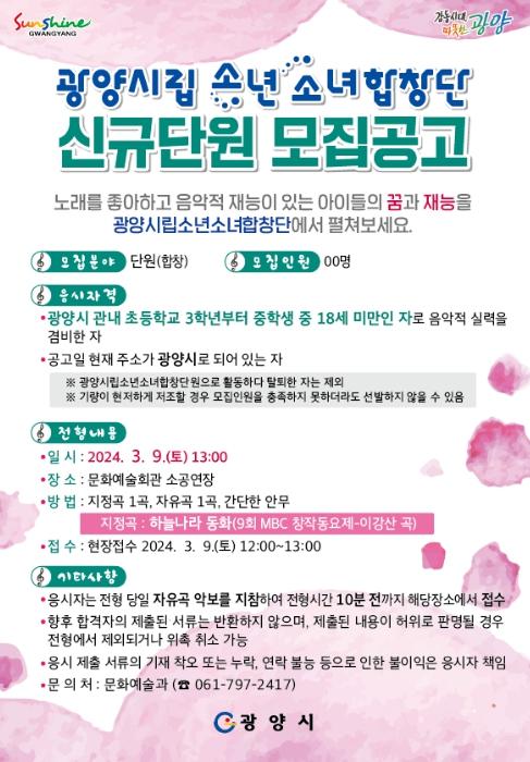 박양균 문화예술과장은 “시립소년소녀합창단은 다양한 공연을 통해 청소년들의 예술적 재능을 키우고 동요 보급과 문화예술 저변 확대에 기여하고 있다”며 “이번 신규 모집에 음악을 사랑하고 노래에 소질이 있는 청소년들이 많이 참여해 주길 바란다”고 말했다.