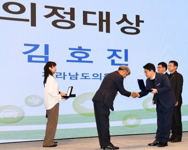 전라남도의회 김호진 의원(더불어민주당?나주1)이 최근 사단법인 탄소중립실천연대 한국본부로부터 ‘2050탄소중립 의정대상’을 수여받았다.