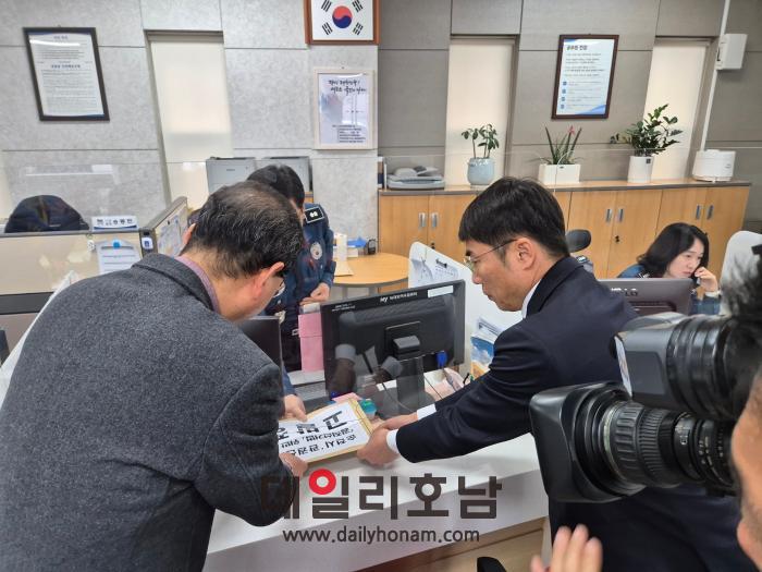 소병철·손훈모 예비후보 측이 연대해 신성식 예비후보를 겨냥해 관권선거 의혹을 제기하며 20일 오전, 전남도경찰청에 수사를 요구하는 고발장을 접수했다. (소병철·손훈모 예비후보 선거사무소 제공)
