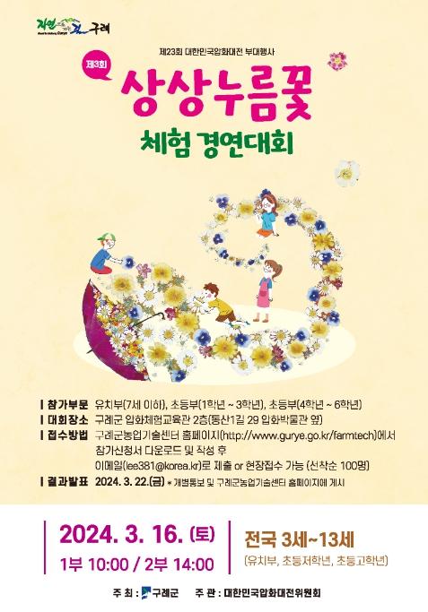 상상누름꽃 체험 경연은 꽃과 잎을 눌러서 말린 누름꽃(압화)을 이용하여 자유주제로 자신만의 개성 있는 상상력을 뽐내는 대회로 전국 3세부터 13세를 대상으로 개최되며 참가비는 무료다.