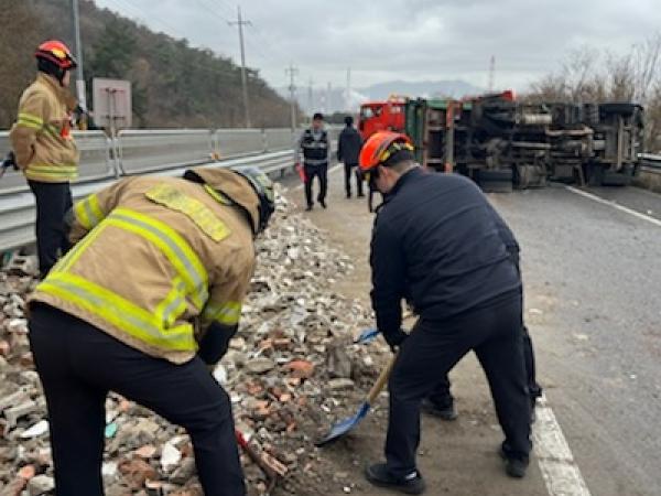 여수소방서 119구조대는 21일 11시 35분경 여수시 엑스포대로(여수에서 순천방향)에서 폐기물 처리차량이 넘어지며 편도 2차로, 마주오는 도로 1차로를 막아버려 도로가 통제되어 현장 안전조치를 실시했다.