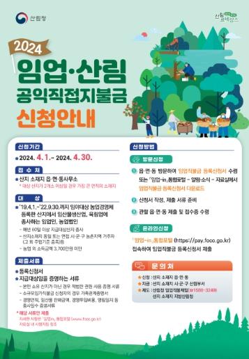 전라남도는 2024년 임업·산림 공익직접지불금 접수를 4월 1일부터 30일까지 진행한다고 밝혔다.