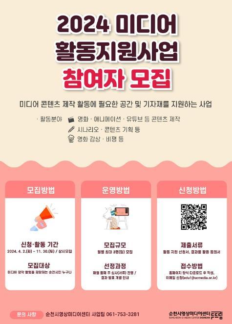 순천시영상미디어센터는 '2024 미디어활동 지원사업'을 운영한다고 밝혔다.