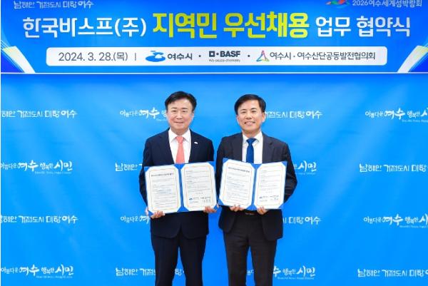 시에 따르면 지난 28일 오후 시장실에서 여수시와 한국바스프(주)가 ‘여수산단 지역민 우선채용’ 협약을 체결했다.