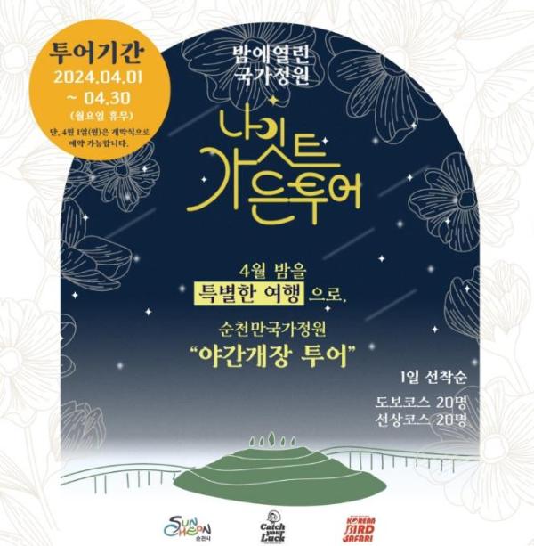 순천시는 순천만국가정원 개막에 맞춰 4월 1일부터 30일까지 1개월간 국가정원 야간 프리미엄 투어 프로그램‘나이트 가든투어’를 시범운영한다.
