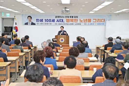 고흥군은 지난 28일 (사)대한노인회 고흥군지회 부설 노인대학(원) 강의실에서 노인대학생 100여 명이 참석한 가운데 ‘인생 100세 시대, 행복한 노년을 그리다’라는 주제로 특강을 진행했다.