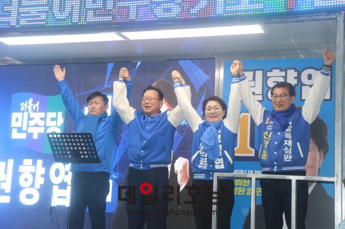 공식적인 선거운동이 시작된 지난 28일 김부겸 민주당 공동상임선대위원장과 신정훈 민주당 전남도당 상임선대위원장이 광양을 찾아 권향엽 후보 지지를 호소했다. 사진 왼쪽부터 서동용 상임선대위원장, 김부겸 민주당 공동상임선대위원장, 권향엽 후보, 신정훈 민주당 전남도당 상임선대위원장 순이다. (권향엽 선거대책위 제공)