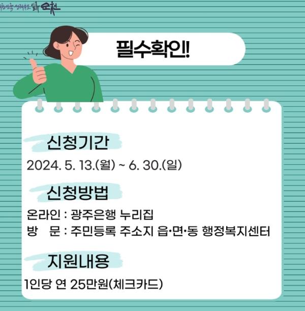 신청방법은 광주은행 누리집을 통해 온라인으로 신청하거나 주민등록 주소지 관할 읍?면?동 행정복지센터를 방문하여 신청하면 된다.
