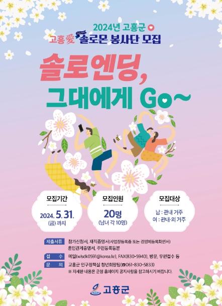 고흥군은 미혼남녀 인연 맺기를 위한 ‘고흥솔로엔딩, 그대에게 GO~’에 참가를 희망하는 남·여 20명을 오는 5월 31일까지 모집한다고 밝혔다.