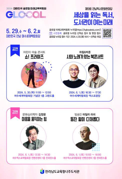 이번 강연은 5월 29일부터 여수에서 열리는 2024 대한민국 글로컬 미래교육박람회와 연계하여 운영하는 제9회 전남독서문화한마당의 일환으로 진행된다.