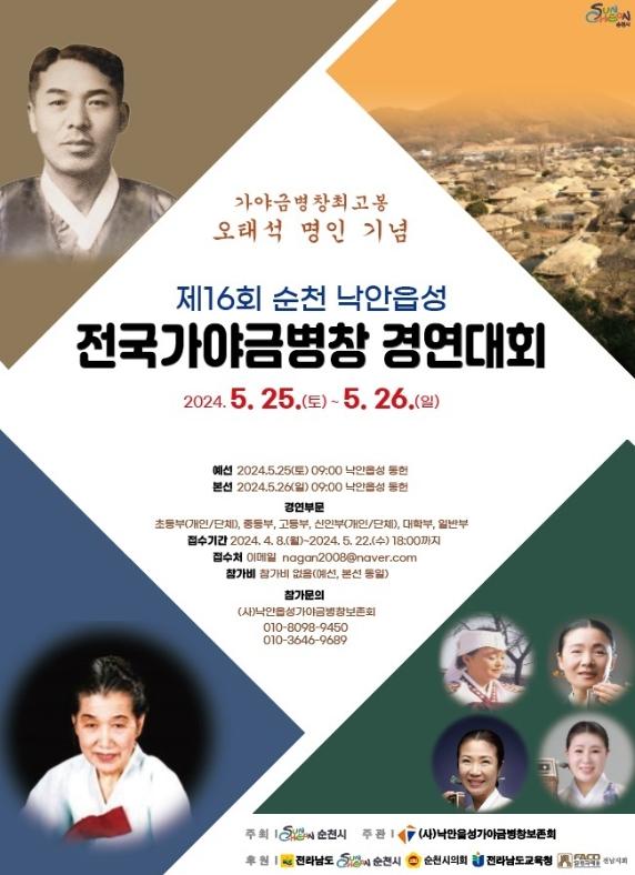 순천 낙안읍성에서 『제16회 전국 가야금병창 경연대회』가 오는 25일부터 26일까지 이틀간 열린다고 밝혔다.