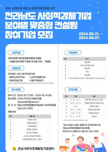 전남사회적경제통합지원센터는 사회적경제기업의 경쟁력 제고를 위해 ‘2024년 전라남도 사회적경제기업 분야별 맞춤형 컨설팅’참여 기업을 모집한다고 밝혔다.