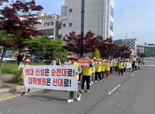 이날 궐기대회에 참석한 200여 명의 해룡면 주민들은 매안사거리에서 전남 동부청사까지 행진하면서 “의과대학은 순천대, 의대병원은 신대”를 요구하며 구호를 외쳤다.