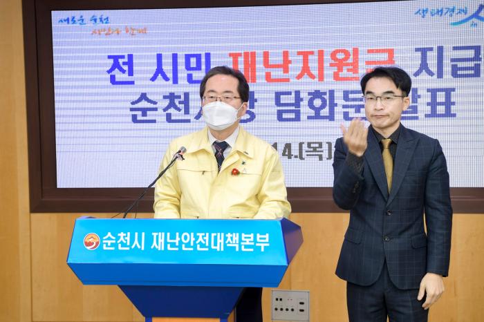 14일 허석 순천시장은 영상 브리핑을 통해 모든 순천시민에게 '코로나19' 긴급재난지원금 10만원을 지급한다고 밝혔다.(사진)