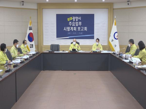 광양시는 1월 13일 시청 상황실에서 2021년 주요업무 시행계획 보고회를 개최하고 올해 주요업무 시행계획과 역점사업 및 부진사업 등에 대해 집중분석했다.