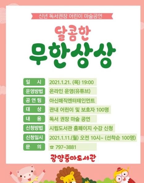 고근성 도서관운영과장은 “새해를 맞아 어린이 독서 활동을 돕기 위한 공연을 준비했으며, 코로나19로 인해 부득이 온라인으로 진행한다”며, “이번 공연에 학부모의 많은 관심과 참여 부탁드린다”고 말했다.