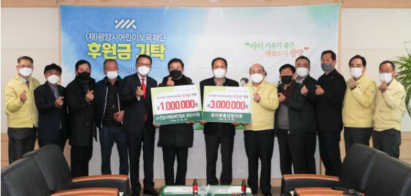 (재)광양시어린이보육재단은 지난 18일 정현복 광양시장과 황재우 보육재단 이사장, 기탁자 등 10여 명이 참석한 가운데 후원금 기탁식을 가졌다고 밝혔다.