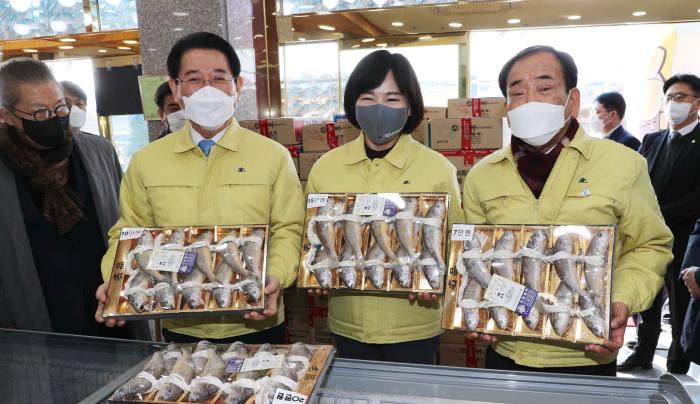김영록 전남도지사는 지난 3일 설 명절을 앞두고 전현희 국민권익위원장(사진 가운데)과 함께 영광을 찾아 수산물 판매 관계자들의 현장 목소리를 들었다.