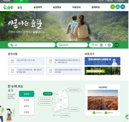‘숲나들이(e)’ 누리집에서는 그동안 전국 159개 자연휴양림(국립 42, 공립 107, 사립 10개)을 통합하여 서비스를 제공하였으나,국민들에게 보다 많은 산림휴양 정보 등을 제공하여 종합 숲-여행을 즐길 수 있도록 숲길과 산림레포츠로 서비스 범위를 확대하였다.